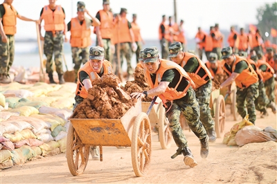 面对严重洪涝灾害,东部战区抗洪抢险部队分别成立了临时党委、党支部,配好配强党委(支部)书记,组建了上百个党员突击队,发挥先锋模范作用,让抗洪抢险更加高效。图为7月17日,武警江西总队机动支队党员突击队奋战在鄱阳县昌江圩大堤上。新华社发(曹先训 摄)