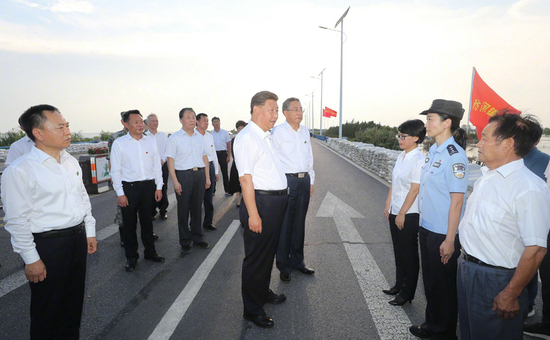 19日下午,习近平来到合肥市肥东县十八联圩生态湿地蓄洪区巢湖大堤罗家疃段,察看巢湖水势水情。