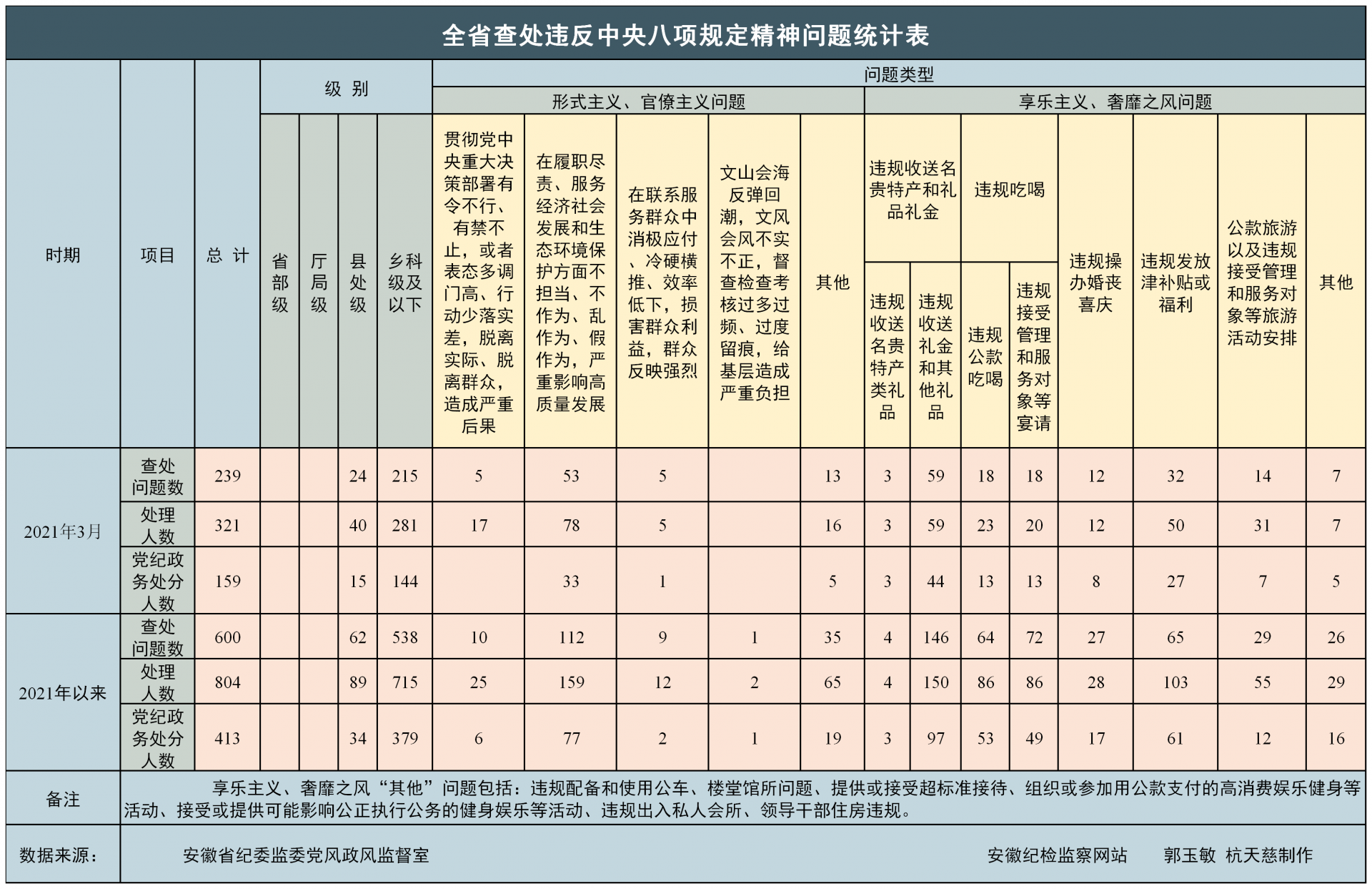 2021年一季度,全省纪检监察机关共查处违反中央八项规定精神问题600起,批评教育帮助和处理804人,给予党纪政务处分413人。