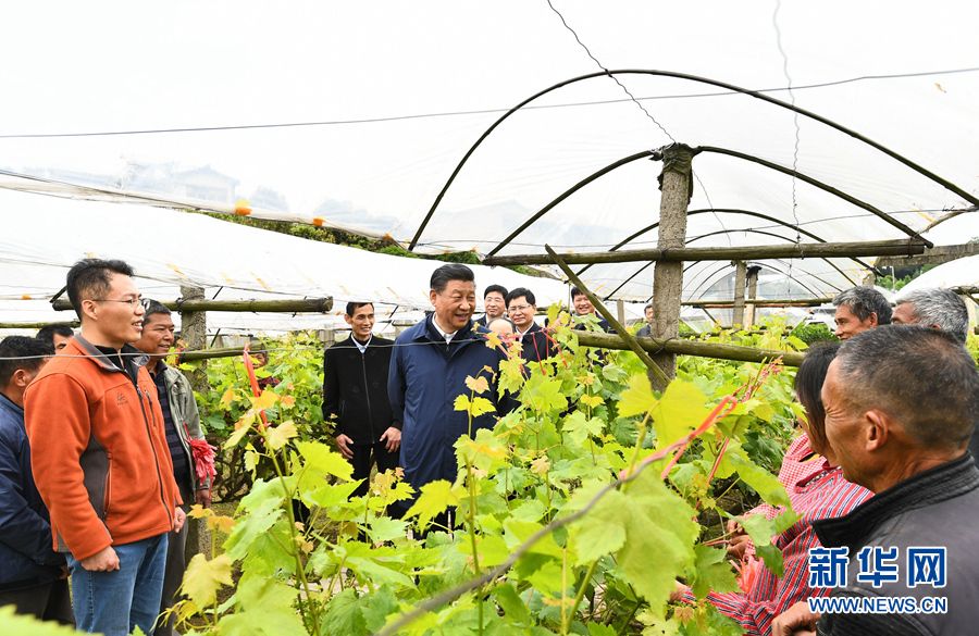 4月25日至27日,中共中央总书记、国家主席、中央军委主席习近平在广西考察。这是25日上午,习近平在桂林市全州县才湾镇毛竹山村,走进葡萄种植园,同农技人员和村民亲切交流。新华社记者 谢环驰 摄